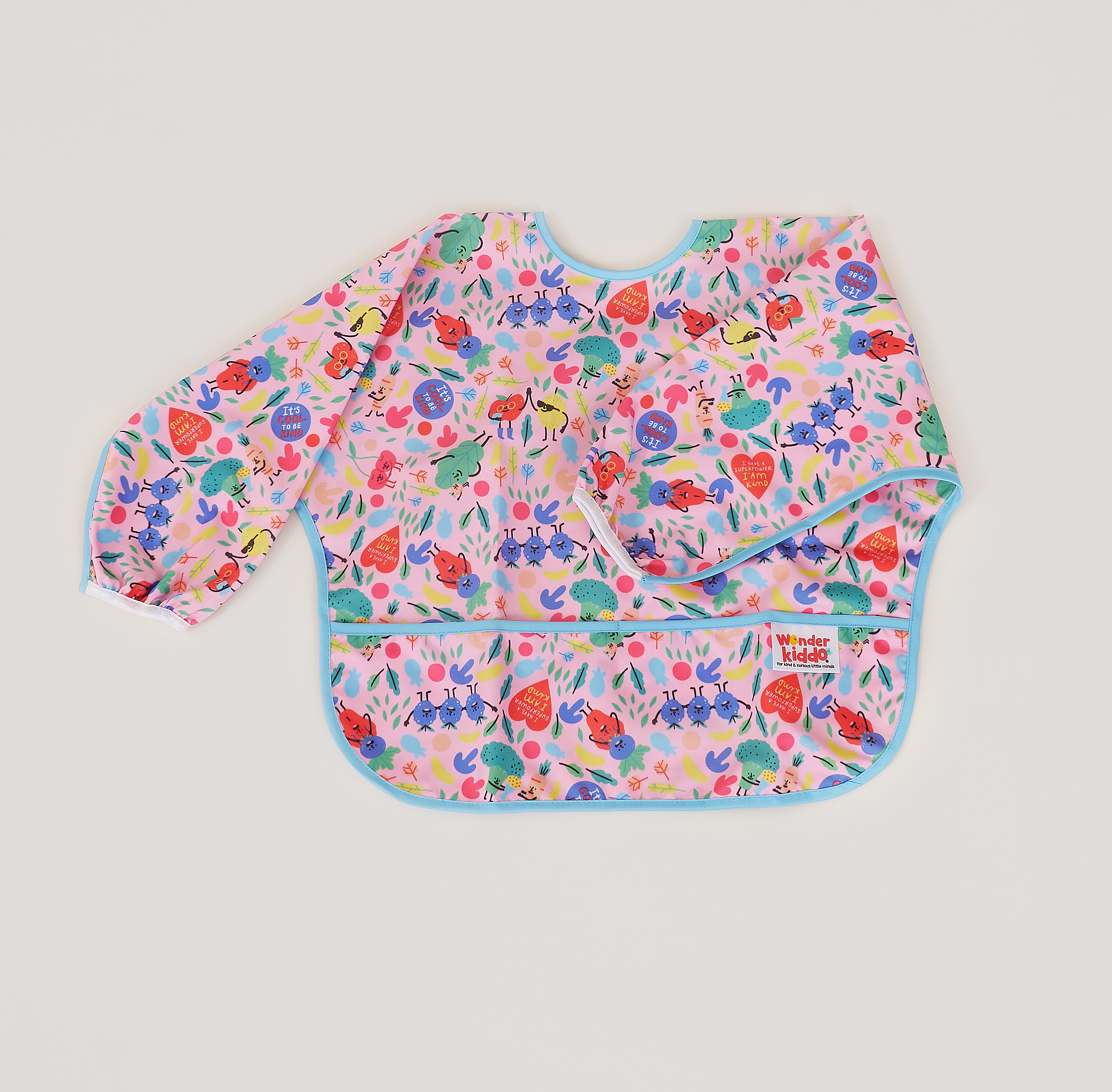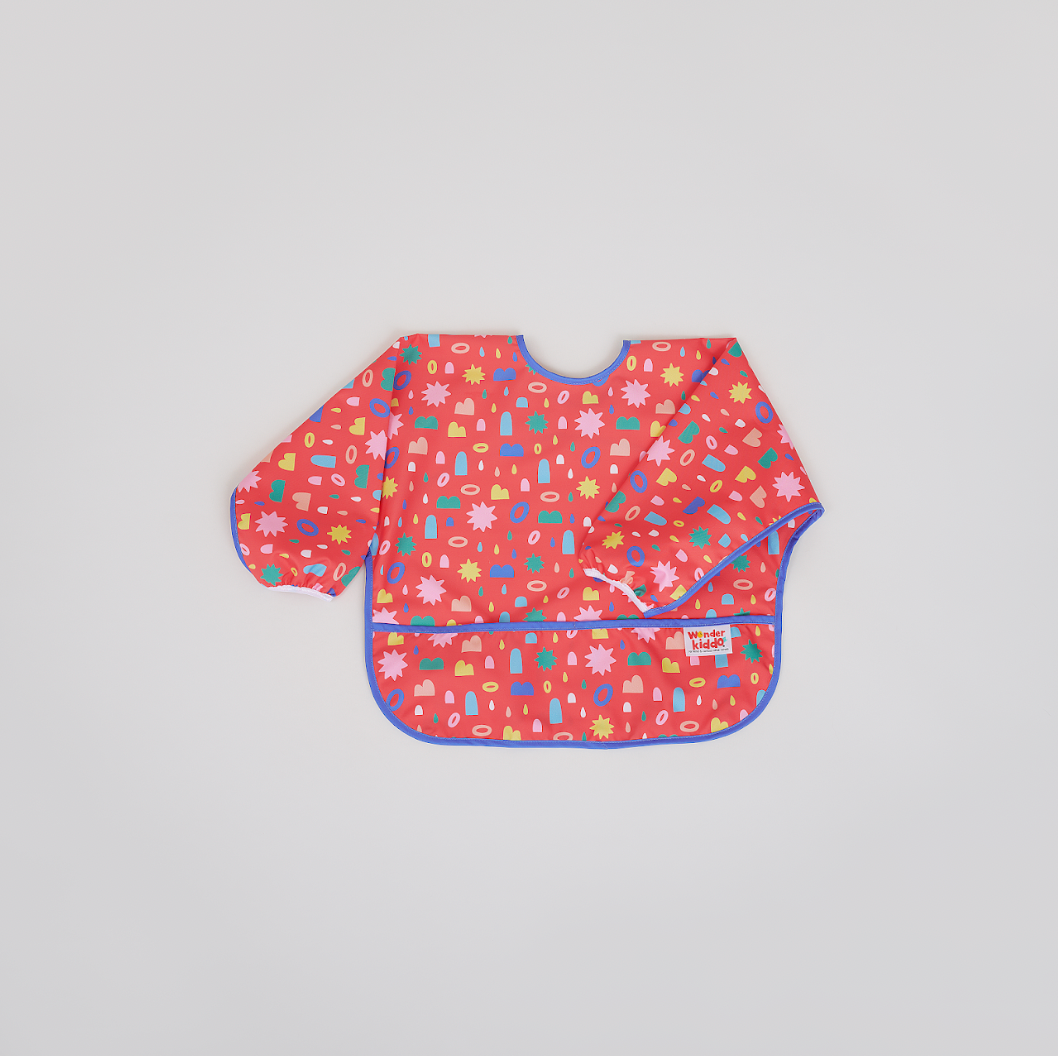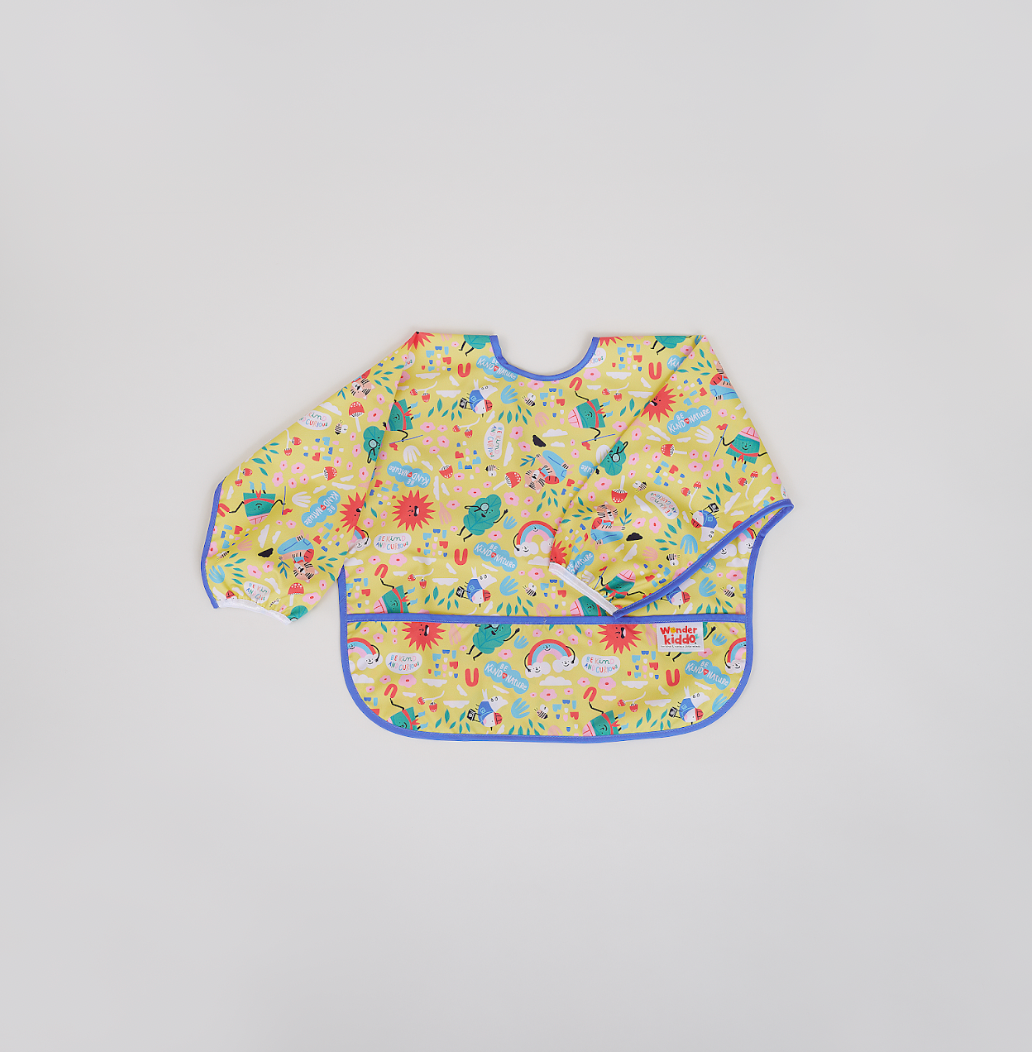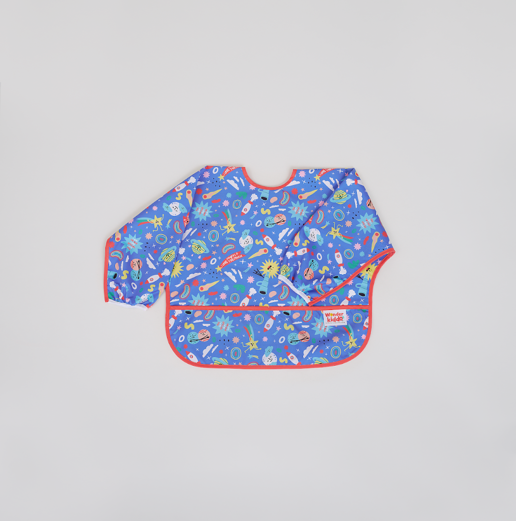 Los baberos Wonder Kiddo tienen una tela impermeable de tacto suave que protege la ropa de cualquier mancha o suciedad. Esta versión manga larga, permite tener una mayor cobertura de los brazos y cualquier prenda con mangas. Su tela es resistente al constante lavado y uso, y es de rápido secado. Cuenta con un cierre posterior en velcro, que le permite ajustarse de manera segura a la medida del cuello del niño y desajustarse rápidamente cuando se requiera. El bolsillo tipo “recoge todo” atrapa la comida evitando que caiga al piso y además permite que el niño pueda tomar de nuevo algún trozo de comida que se haya soltado de su mano o boca.