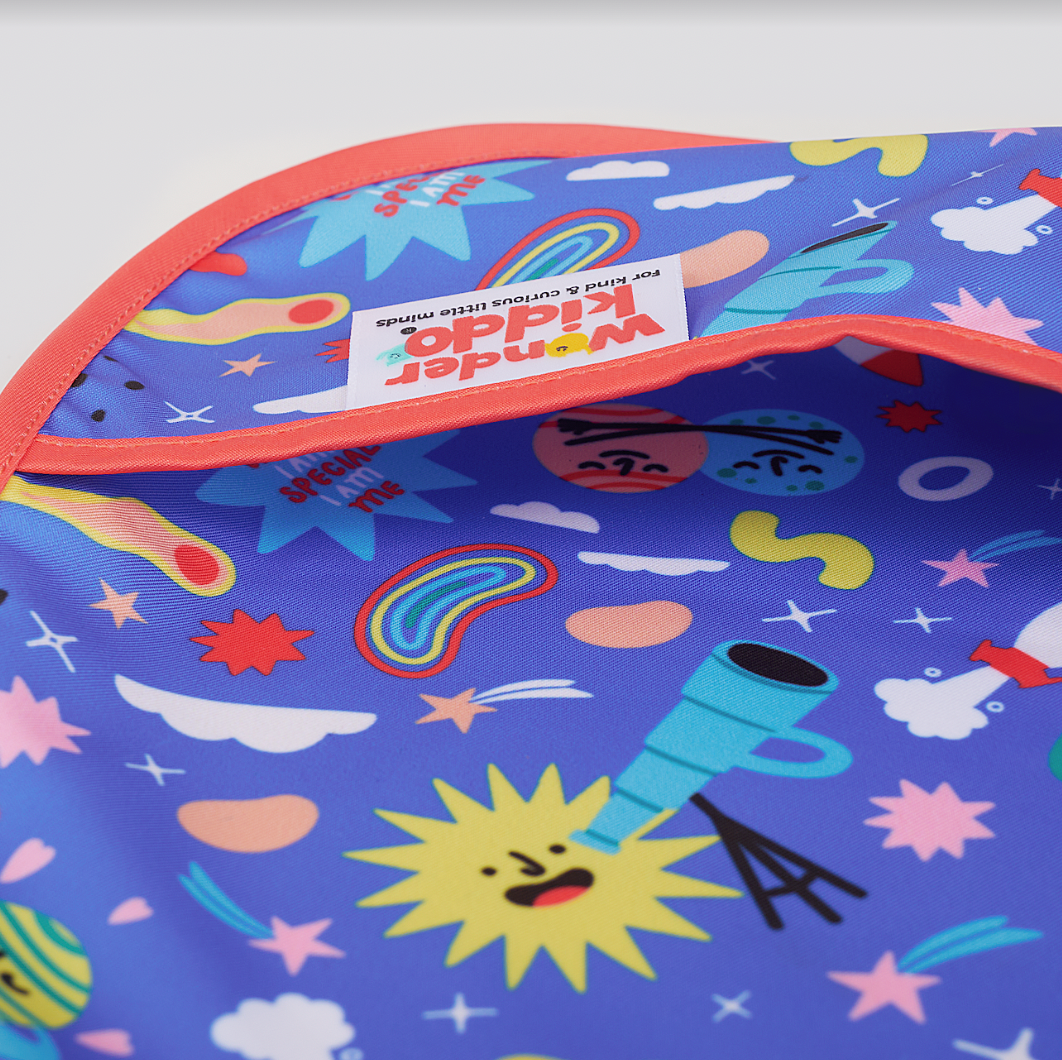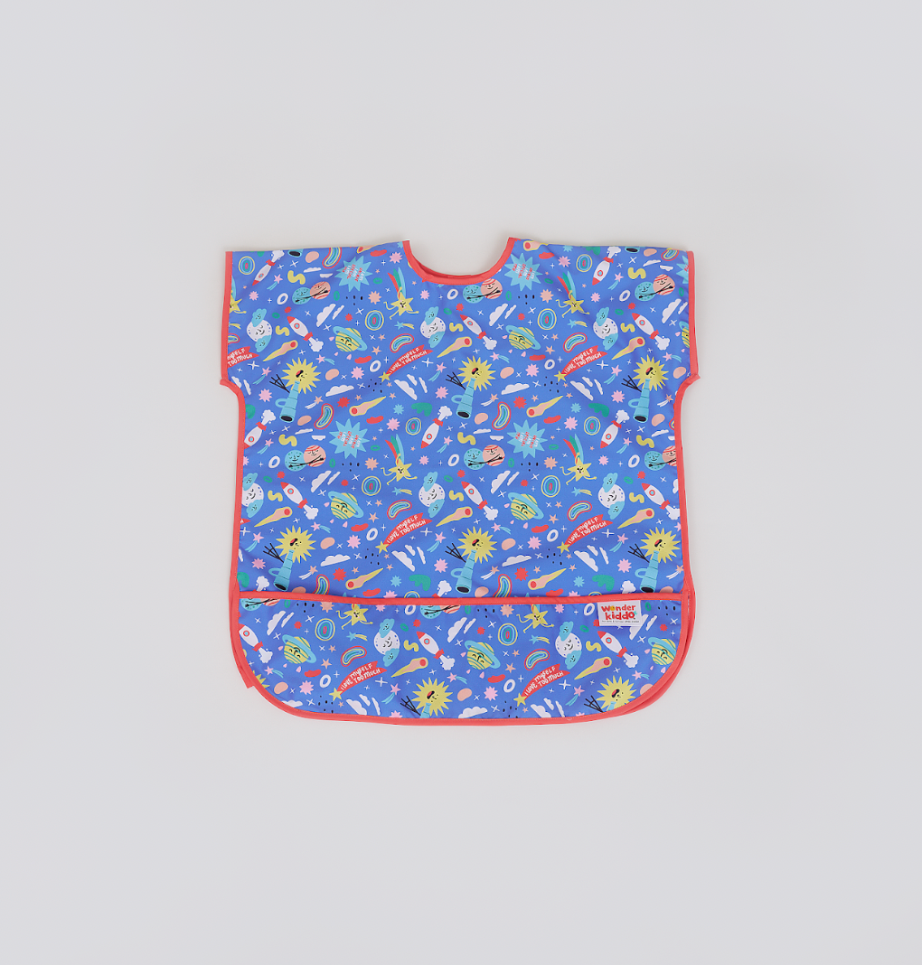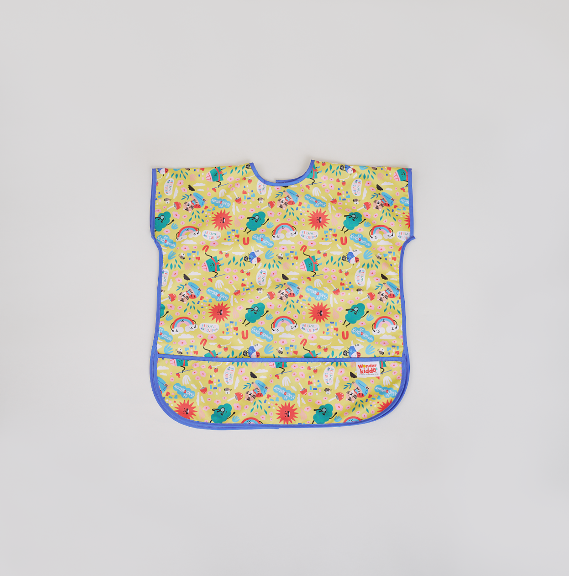 El delantal manga corta Wonder Kiddo es ideal para proteger la ropa y el cuerpo del niño de cualquier mancha o suciedad durante la experimentación con pintura, arcilla u otro material de arte. Esta versión manga corta es ideal para climas cálidos; su tela impermeable y ligera de tacto suave, lo hace cómodo durante su uso. Este delantal además de tener una mayor cobertura en espalda, cuenta con un cierre posterior en velcro que le permite ajustarse de manera segura y desajustarse rápidamente cuando se requiera. Contiene un bolsillo para guardar y proteger utensilios de arte. También puede ser utilizado como babero para aquellos niños que hayan superado la talla de nuestro babero manga corta.