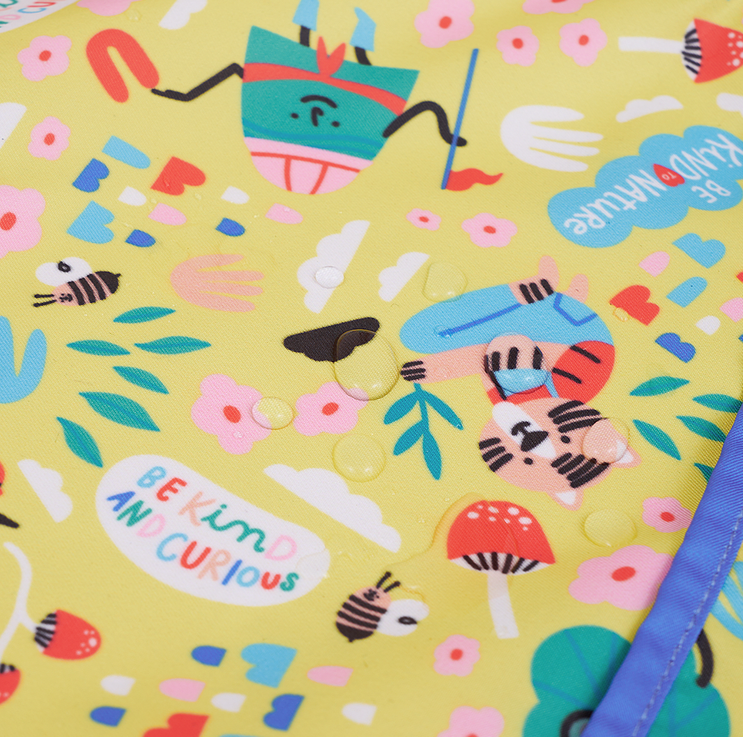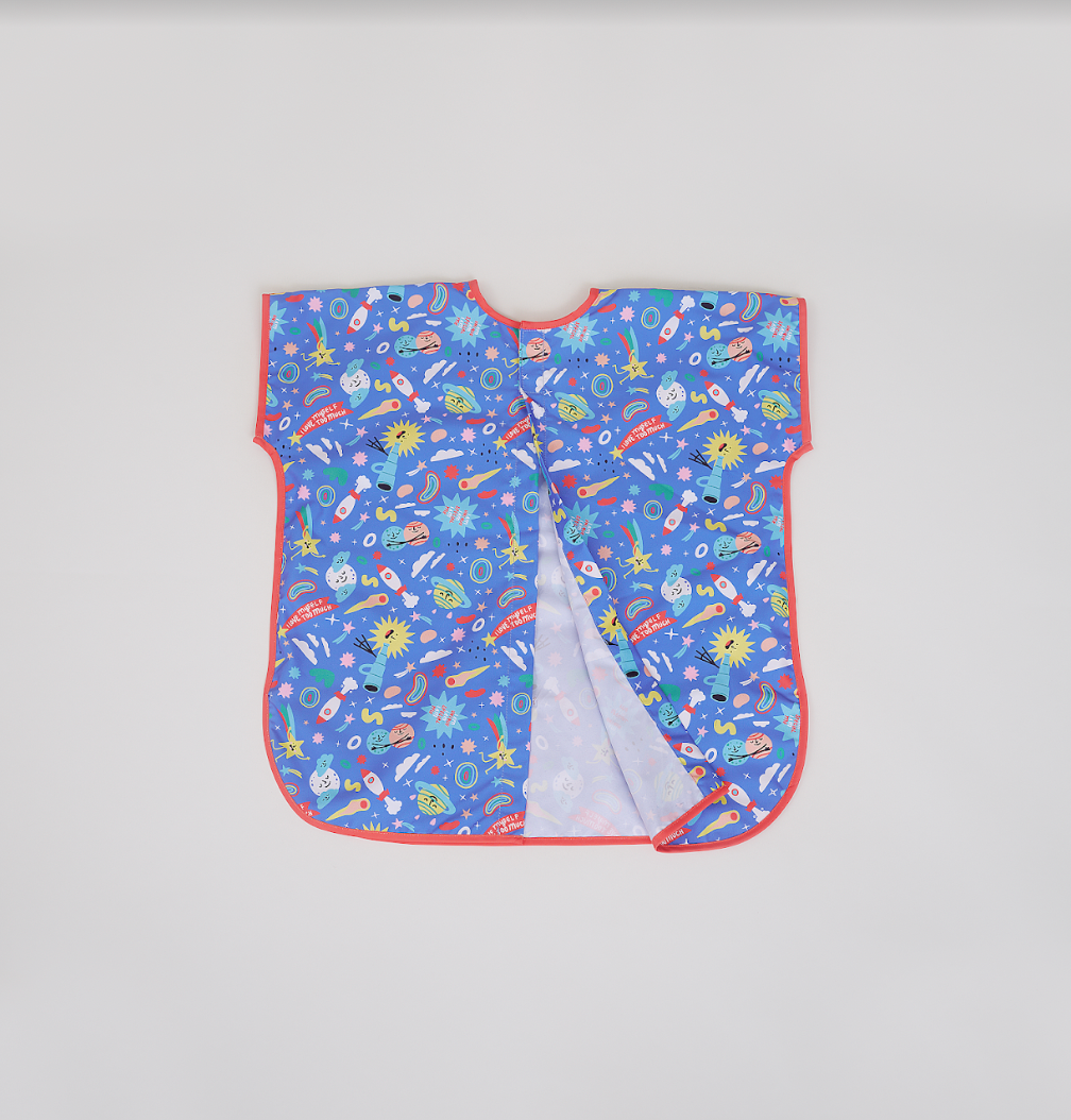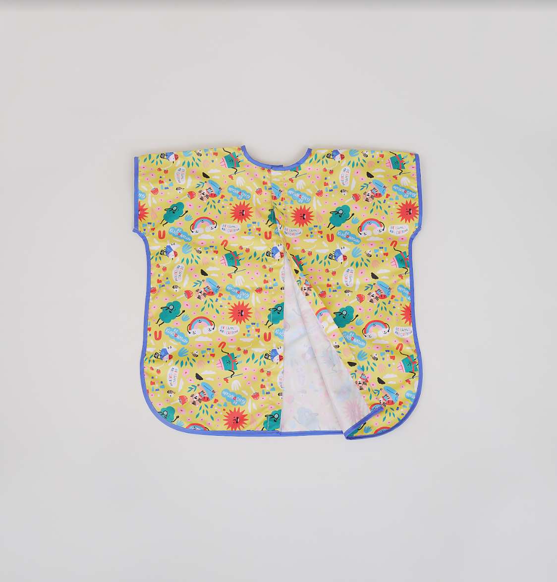 El delantal manga corta Wonder Kiddo es ideal para proteger la ropa y el cuerpo del niño de cualquier mancha o suciedad durante la experimentación con pintura, arcilla u otro material de arte. Esta versión manga corta es ideal para climas cálidos; su tela impermeable y ligera de tacto suave, lo hace cómodo durante su uso. Este delantal además de tener una mayor cobertura en espalda, cuenta con un cierre posterior en velcro que le permite ajustarse de manera segura y desajustarse rápidamente cuando se requiera. Contiene un bolsillo para guardar y proteger utensilios de arte. También puede ser utilizado como babero para aquellos niños que hayan superado la talla de nuestro babero manga corta.